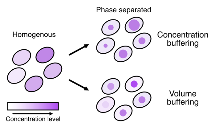 New collaborative preprint with the groups of Thomas Michaels and Fred Allain at ETH, driven by Benjamin Frühbauer from our lab! In 1-component phase separated systems, changes in concentration leads to changes in condensate volume, such that the protein concentration is buffered in both phases. In multi-component systems exhibiting volume buffering, the total condensate volume remains constant even when the protein concentration changes. We propose that volume buffering is a powerful spatial control mechanism within cells.